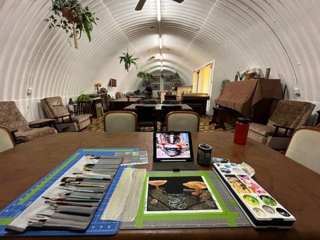I have created a series of art workshops called “Brushes in Bunkers” ranging from complete beginners to more advanced artists. They will be held in an old 60ft WWII underground bunker which remains cool most of the year round. These include black & white workshops in pen & ink, and watercolour and ink workshops. If you want to learn more techniques, then there are perspective workshops, trees & stumps. Other workshops under development are backgrounds and learning about composition and multi day workshops in Acrylic painting.