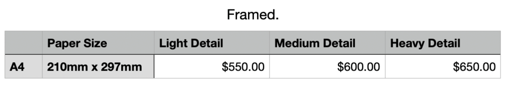 My black label collection of artworks are only available in Australia and in one size at this stage, A4. My premium range is framed in none reflective glass, however there are still three categories of detail on offer.