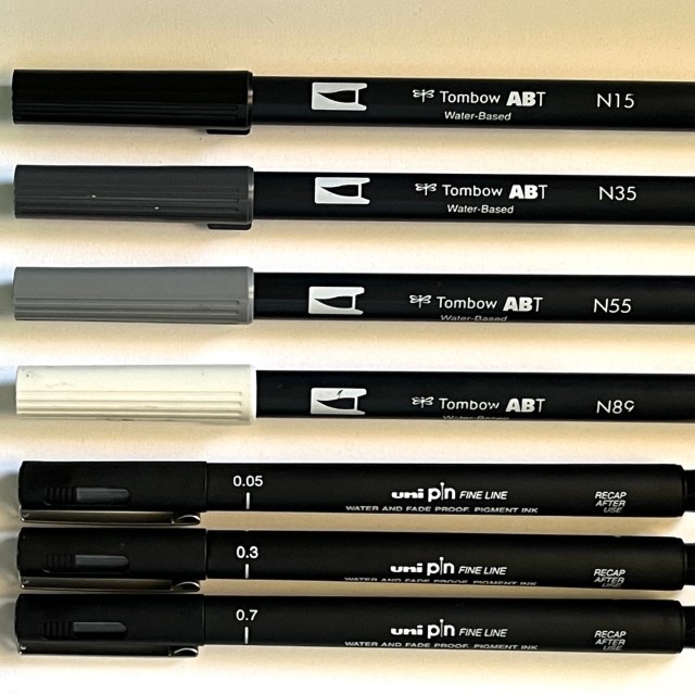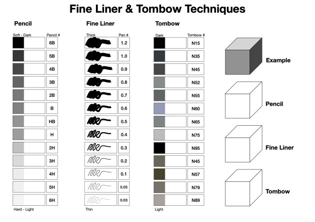 How to use Fine Liners and Tombow pens to create a variety of marks on paper. The difference between Fine Liners, Tombow, and pencils and which to use for the best effect.